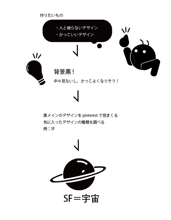 私はタイトルにもあるように、デザインは連想ゲームで目的からスタートしてテーマを決めるようにしています。